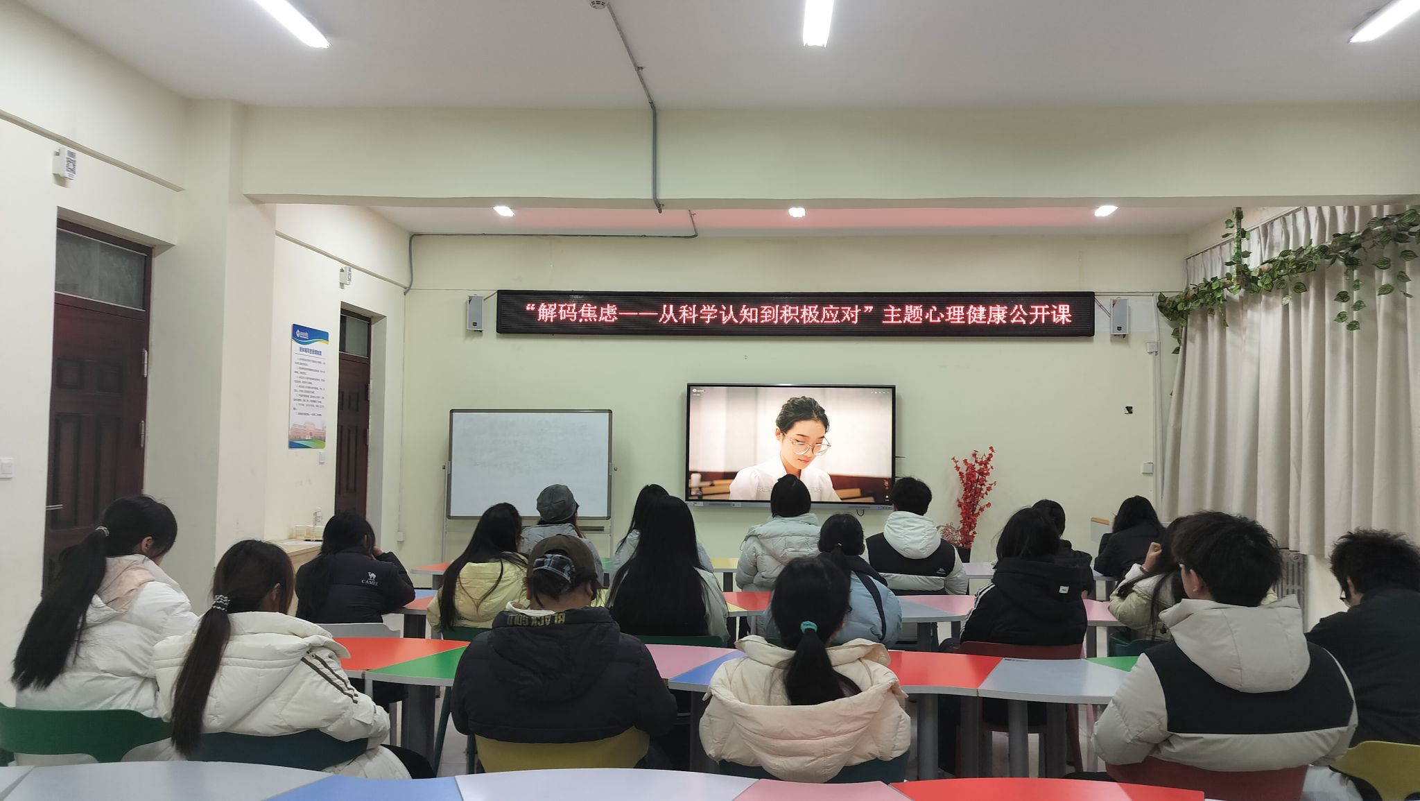 为进一步加强大学生心理健康教育,引导大学生积极应对情绪困扰,特别是考试前的焦虑情绪,提升心理调适能力,12月15日晚,按照省委教育工委、省教育厅的文件精神,学校在心理中心团辅室和各学院设立会场组织心理健康教育教师和学生观看了“解码焦虑——从科学认知到积极应对”主题心理健康公开课。