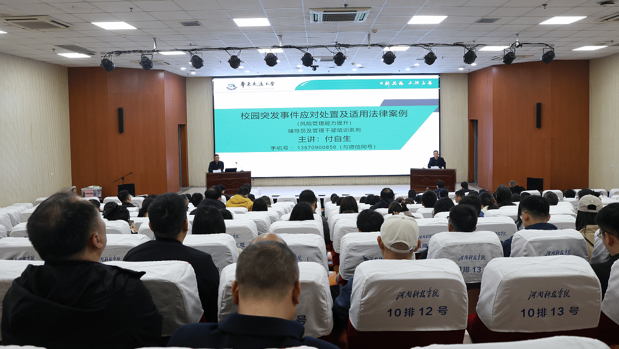 本次论坛特邀原华东交通大学保卫处处长付自生作专题辅导报告。报告以《谱好学生突发事件应对与处置“三部曲”—预防、响应、善后》为主题,聚焦高校校园安全管理核心工作。付自生结合多年平安校园建设、突发事件处置一线经验,以高校学生安全工作的重要性为引,围绕源头维稳(事件预防为本)、协调合力(事中妥善处置)、警示启迪(事后总结提升)三大核心板块,精准梳理12类校园突发事件主要风险点,紧扣最新法律法规,结合典型案例,深入剖析各类事件的法律适用依据与实操处置技巧。在互动交流环节,付自生针对辅导员日常工作中遇到的应急处置难题逐一答疑解惑,现场交流氛围浓厚、反响热烈。整场报告内容翔实、逻辑清晰、深入浅出,兼具理论指导性与实践操作性,为我校学工队伍提升应急处突能力、规范突发事件处置流程提供了精准思路与实用方法。
