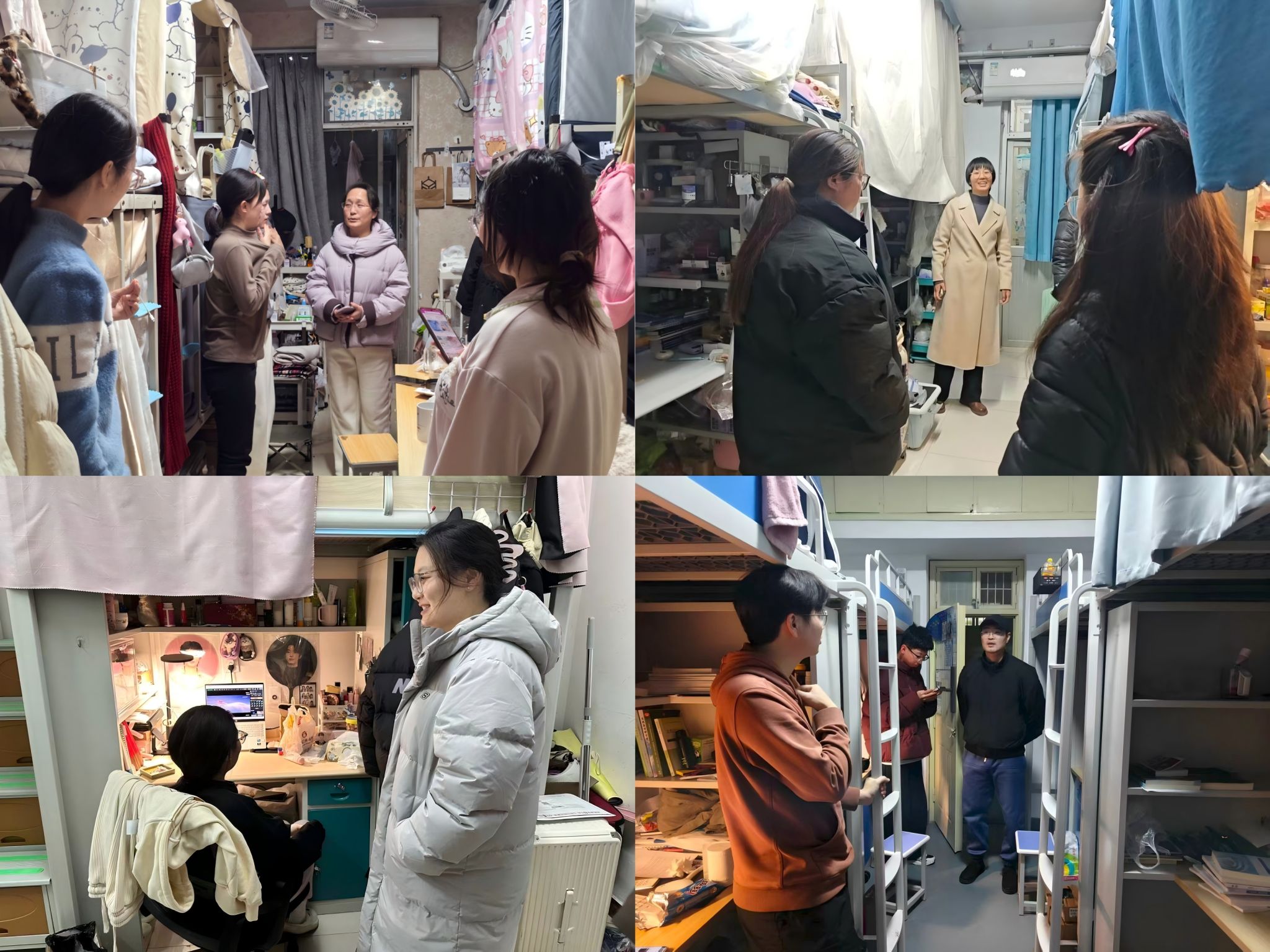 学院领导和辅导员老师深入学生宿舍,实地查看卫生、安全隐患及生活保障情况,与同学们亲切交流,叮嘱大家要严守学校纪律,守牢安全底线,保持良好作息,共同营造温馨和谐的宿舍氛围。