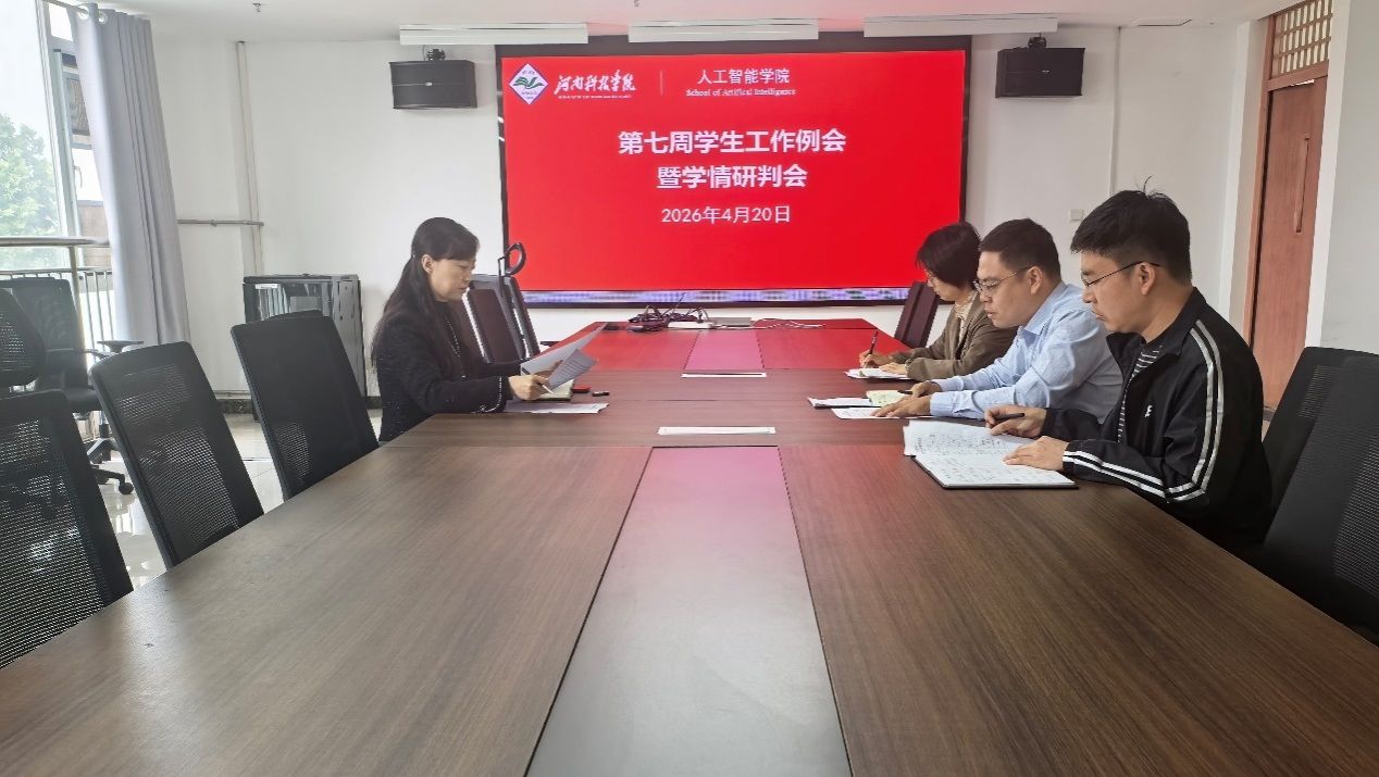 为精准把握学生思想动态与学习状况,统筹推进学院学生管理工作走深走实,4月20日上午,人工智能学院在弘德楼A205召开第七周学生工作例会暨学情研判会。学院党委书记叶晖、党委副书记申冲、团委书记郭小月、辅导员卢留洋参会。