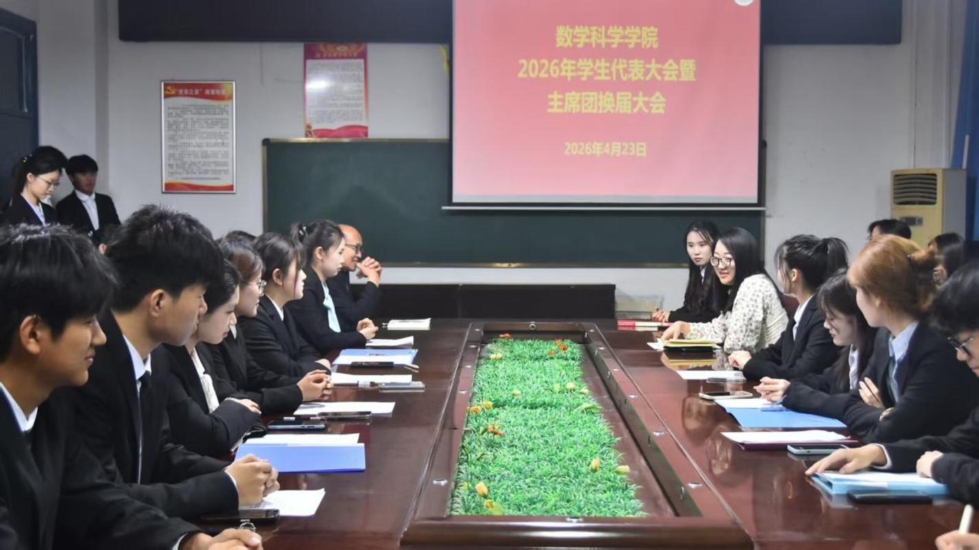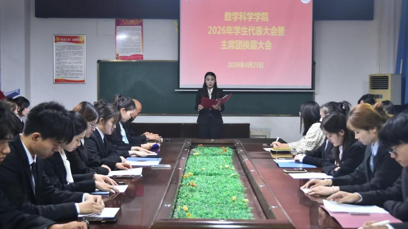 4月23日,数学科学学院于八号楼三楼会议室举办2026年学生代表大会暨主席团换届大会。学院团委书记曲富柱、团委副书记李金璐、辅导员田小霞及全体学生代表共同参会。会议由轮值主席杜怡洁主持。