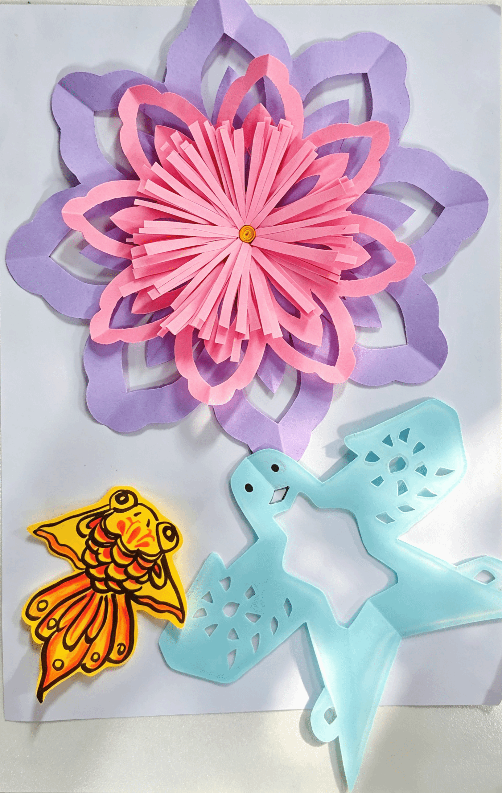 创作过程中,同学们相互交流技巧、分享创意,有的同学耐心指导同伴裁剪造型,有的同学相互借鉴色彩搭配,欢声笑语间,不仅拉近了彼此的距离,更在互动协作中增强了归属感与幸福感。原本普通的卡纸,在同学们的巧手下渐渐变成了一个个造型别致、色彩鲜艳的纸鸢剪纸作品,大家将完成的剪纸成品细心粘贴在A4纸上,进一步修饰点缀,每一件作品都独具特色,既展现了个人的审美与创意,也承载着同学们对心灵安宁的追求。