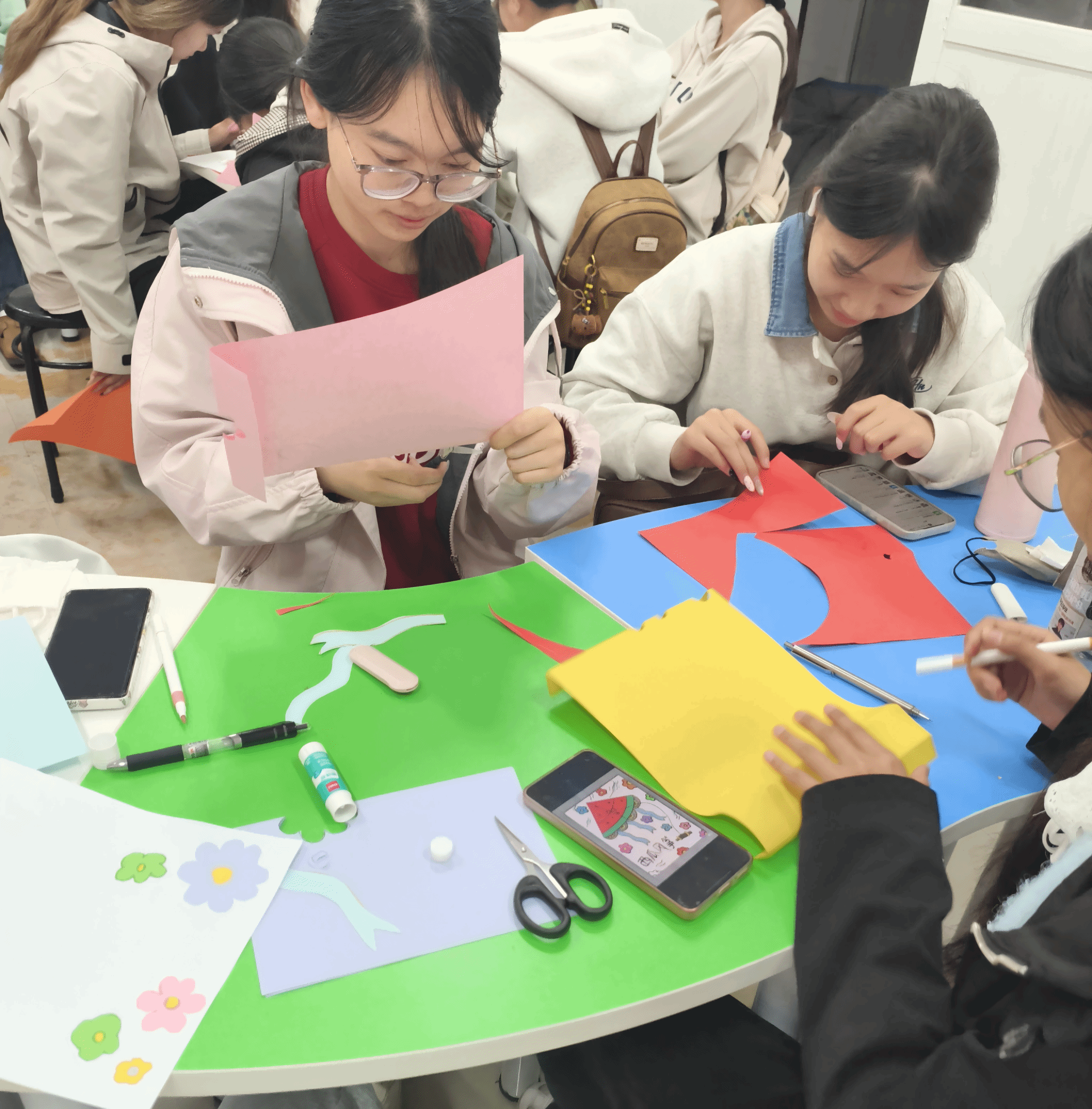 活动现场,学院提前备好A4白纸、彩色卡纸、马克笔等材料,为同学们的创作提供充足保障。同学们在创作中放松身心,将内心的情绪与美好期许融入作品之中,实现“以手造物、以物悦心”的心理提升目标。随后,同学们有序领取材料,迅速投入创作,拿起剪刀裁剪彩色卡纸,勾勒纸鸢的灵动造型,用马克笔精心绘制花纹、点缀色彩,或绘出淡雅的兰草,或勾勒简约的祥云,或写下寄托思念与美好心愿的短句,每一笔都饱含心意,每一刀都尽显巧思,在专注创作中暂时放下学习的疲惫,感受动手的快乐与心灵的宁静。
